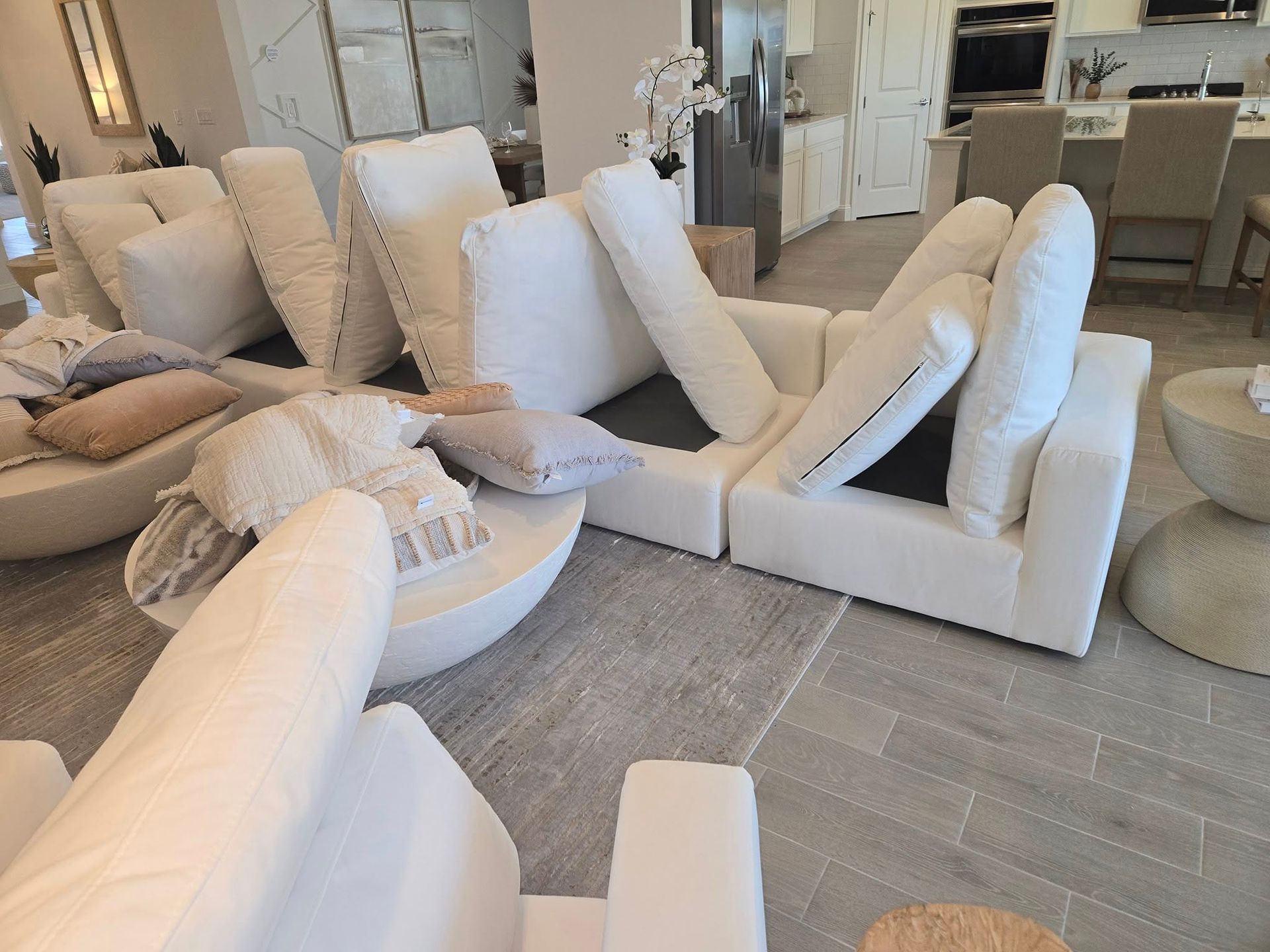Remove loose cushions, clear decorative pillows and throws, and point out any specific stains or problem areas so the technician can apply focused treatment.